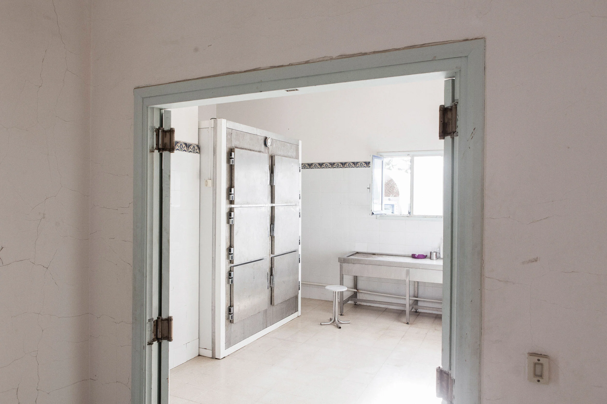 Zarzis, Tunisia. Dr Riadh Belhadj, a general doctor who inspects the bodies that wash ashore in Zarzis and a volunteer for the Tunisian Red Crescent, walks out of the morgue of the General Hospital. The morgue has a capacity for 6 corpses. Usually corpses that ashore are inspected on location and brought directly in the migrant cemetery in the outskirts of the town.